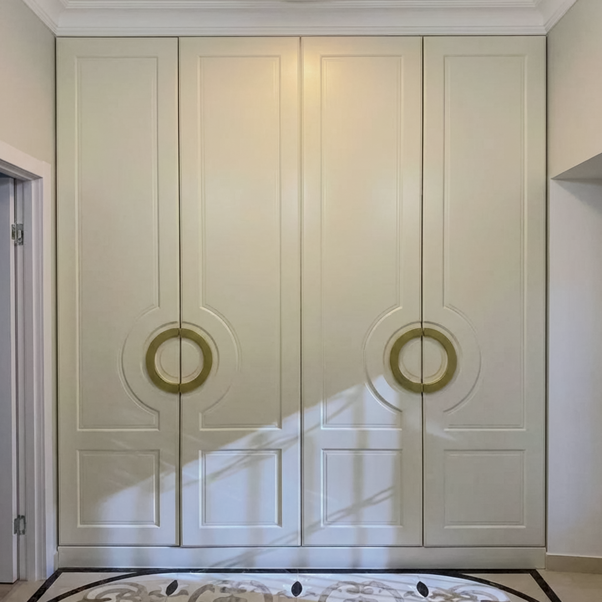 - Встроенный шкаф МДФ матовый кремово-белый с декоративной фрезеровкой и золотистыми ручками