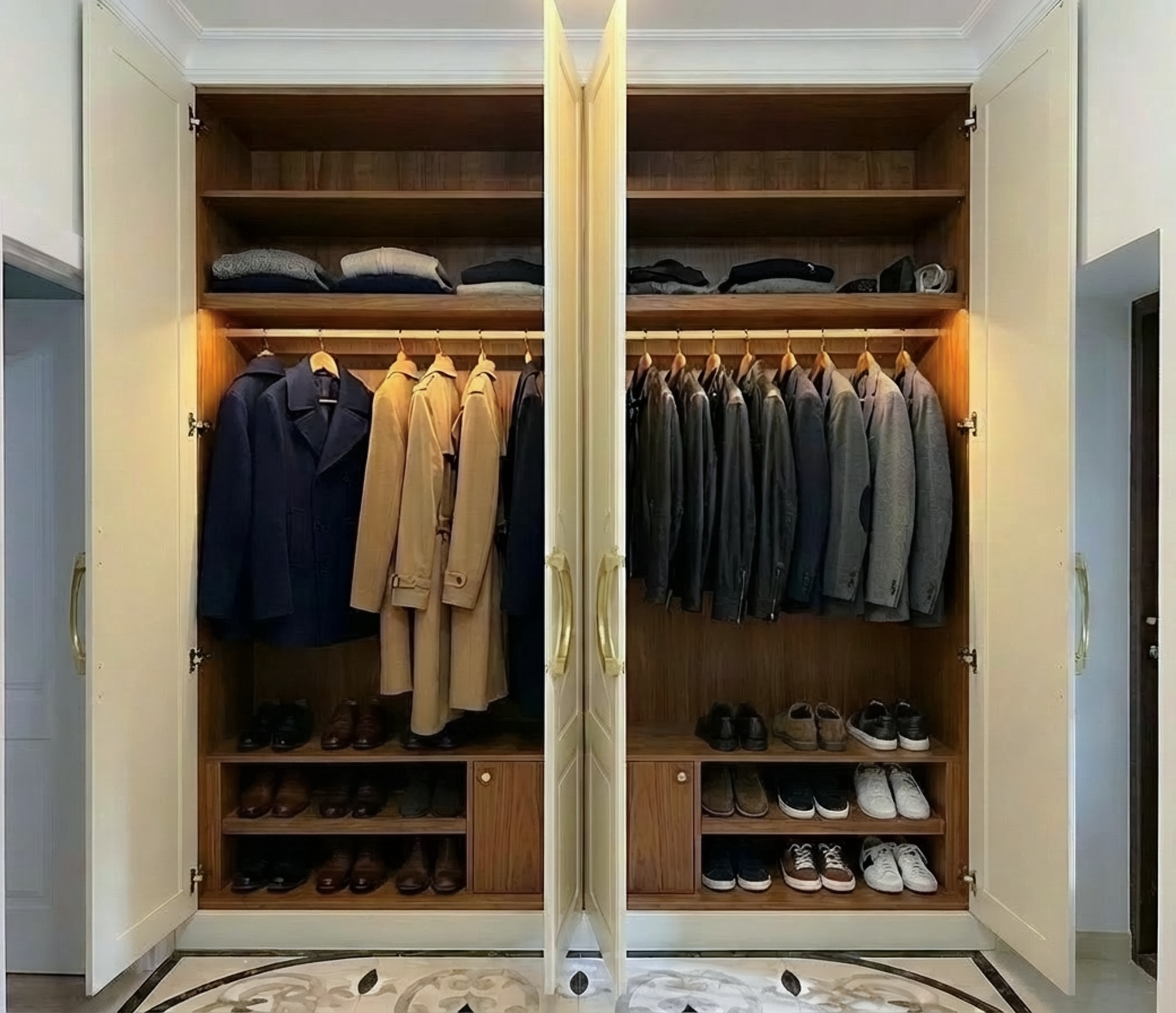 Элегантный встроенный шкаф с распашными дверцами в стиле современной классики — идеальное решение для организации хранения в интерьере.